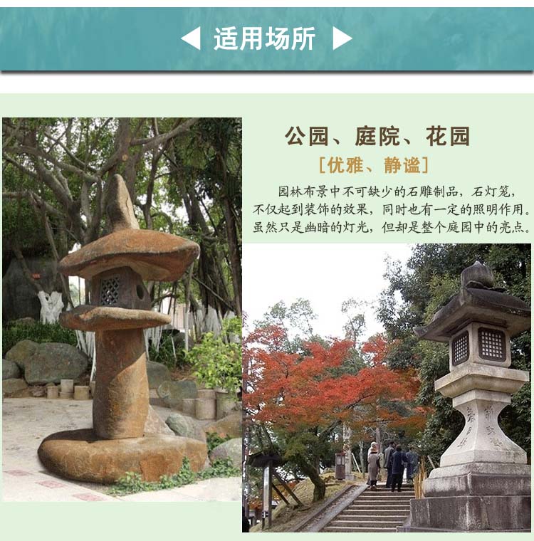 石燈籠是日本石文化的重要內(nèi)容之一,也是近年來我國出口日本石制品的一個重要品種。石燈籠在日本有著非常悠久的歷史。在佛前獻(xiàn)燈火是佛教的重要禮儀之一,自奈良時代 (公元 710~ 794年 )起日本在修建寺院時就開始在寺院的正面建造石燈籠以保護(hù)向寺院所獻(xiàn)的燈火。日本現(xiàn)存的最古老的石燈籠是奈良時代的當(dāng)麻寺石燈籠,距今已有一千多年的歷史了。到了江戶時代 (公元 1603~ 1867年 )石燈籠在日本已廣為流傳,一些寺院里造型精美的石燈籠被作為樣本模仿雕刻以至形成了石燈籠的各種形式。石燈籠被用于園林、庭院的裝飾始于十六世紀(jì)晚期的安土桃山時代,當(dāng)時由于茶道的大發(fā)展,石燈籠常被作為茶室的一種露天裝飾物而廣泛進(jìn)入庭院裝飾。隨著石燈籠用途的改變,石燈籠的樣式也就更加多樣化了,例如出現(xiàn)了三腳或四腳的雪見燈籠,同時對竿和笠的部分也給予新的設(shè)計,石燈籠的式樣由模仿進(jìn)入創(chuàng)新。現(xiàn)在日本的石燈籠除了少量用于寺院神社以外,大多數(shù)的石燈籠是用于庭院、園林裝飾使用。