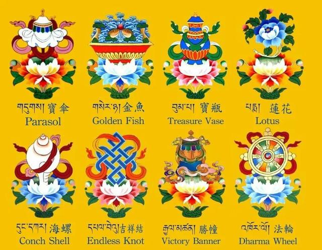 “佛教八寶”亦稱“吉祥八寶”或“八吉祥”或“八瑞相”等,即“輪螺傘蓋花罐魚長”,展開來就是法輪、法螺、寶傘、白蓋、蓮花、寶瓶(罐)、金魚(雙魚)、盤長(吉祥結(jié))。