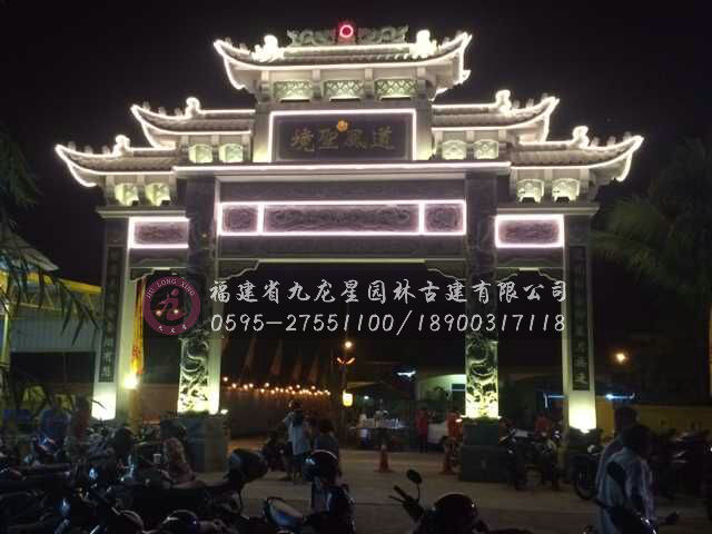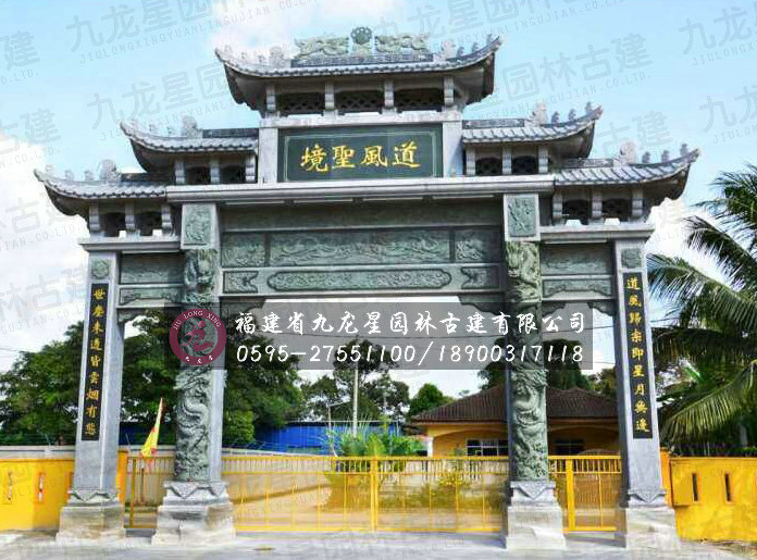 石雕牌坊的造型大氣美觀,結(jié)構(gòu)合理勻稱,周身雕刻著各種吉祥圖案,代表著我國的傳統(tǒng)文化,各種吉祥物也反映出人們對于美好生活的向往。石雕牌坊按照開門數(shù)一般可分為三門、五門、七門。草白玉、青石、漢白玉以及花崗巖這些石材成為制作石雕牌坊的主要石材。牌坊周身布滿浮雕圖 案,雕刻工藝精美細(xì)膩。常見的瑞獸圖案有龍、鳳、麒麟、鹿(諧“祿”)、魚(諧“余”)等。另外有荷花、牡丹、松鶴、梅蘭竹菊代表著健康長壽、平安幸福。 石雕牌坊頂部的結(jié)構(gòu)造型主要有坊式和樓式兩種,樓式結(jié)構(gòu)的頂部結(jié)構(gòu)復(fù)雜,斗拱以及樓瓦的配合使得整體氣勢恢宏。