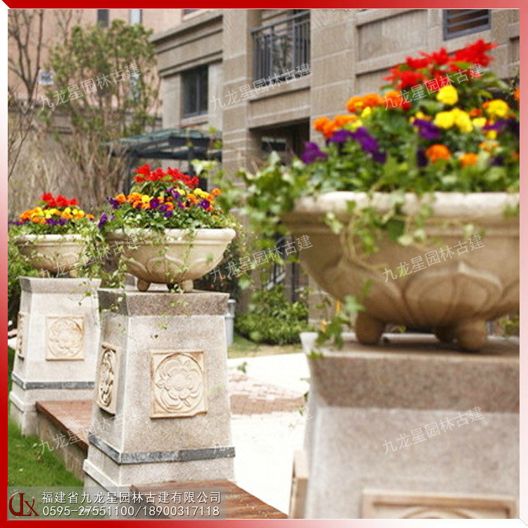 福建石材花缽批發(fā)-九龍星園林古建。石材花缽靈活多樣,隨處可用,尤其對于城鄉(xiāng)建筑比較密集和其他一些難于綠化地區(qū)的美化,有著特殊的意義。石材花缽的擺放可根據(jù)缽、盆樣式、大小的不同,進行多種多樣的藝術組合。組合的形式可以是幾何式、自然式、混合式、集中布置、散置等,具體布局形式可根據(jù)要美化地點的情況決定。在較寬敞的地方,如廠前區(qū)、廣場、大型建筑門前、道路交叉口、停車場等處,石材花缽可布置為樣式多變、五彩繽紛的小花壇,在商店、住宅的門前亦可隨機點綴一二。