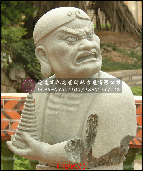 十八羅漢半身像雕塑采用天然優(yōu)質(zhì)石材花崗巖精雕而成,因為花崗巖的自然感染力,加上十八尊羅漢像惟妙惟肖,神態(tài)栩栩如生,使得整套羅漢雕像與園林形成渾然一體的感覺。
