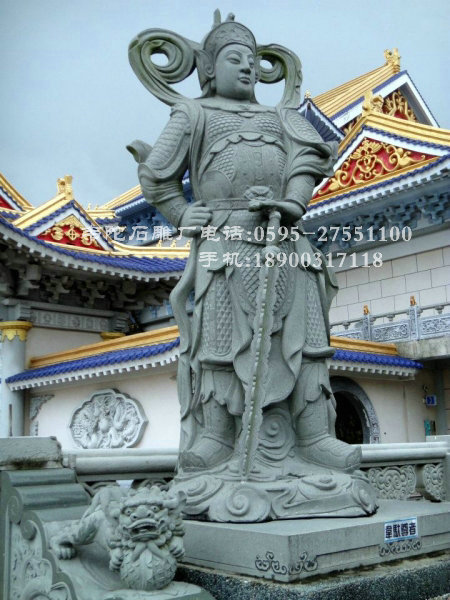 韋馱菩薩像常威武地立于最靠近寺院門口的四天王殿內(nèi),面向寺院,以守護(hù)道場。其形像大多為身穿甲胄的雄壯武將,手持金剛杵,或以杵柱地,或雙手合十,將杵擱于肘間。韋馱菩薩現(xiàn)天大將軍身擔(dān)當(dāng)佛教中驅(qū)除邪魔,保護(hù)佛法的重任,為佛教中護(hù)法金剛力士的代表之一.