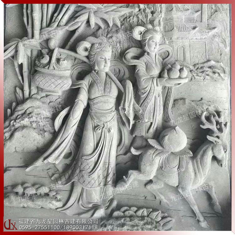 九龍星園林古建浮雕題材:生活風俗、神話故事,諸如吉慶有余、五谷豐登、龍鳳呈祥、平安如意、八仙祝壽、松鶴延年 、太平有象、鹿竹同春、五福臨門、喜鵲登梅、丹鳳朝陽等適用于寺廟浮雕、祠堂浮雕、建筑迎門墻、景區戶外大型建筑外墻石材浮雕