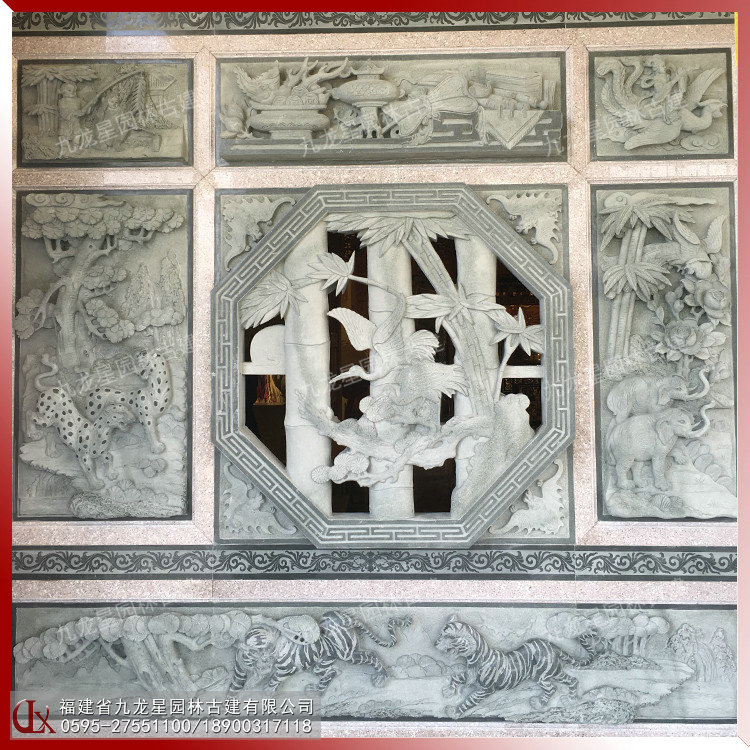 石雕浮雕壁畫在古建筑外墻中占據(jù)重要的地位。古建筑的石雕浮雕在內(nèi)容、形式和材質(zhì)上與圓雕一樣豐富多彩。建筑石雕浮雕常見的材料有青石、花崗巖、白麻、芝麻黑、羅源青、古田青等等。浮雕的雕刻技藝和表現(xiàn)體裁與圓雕基本相同。